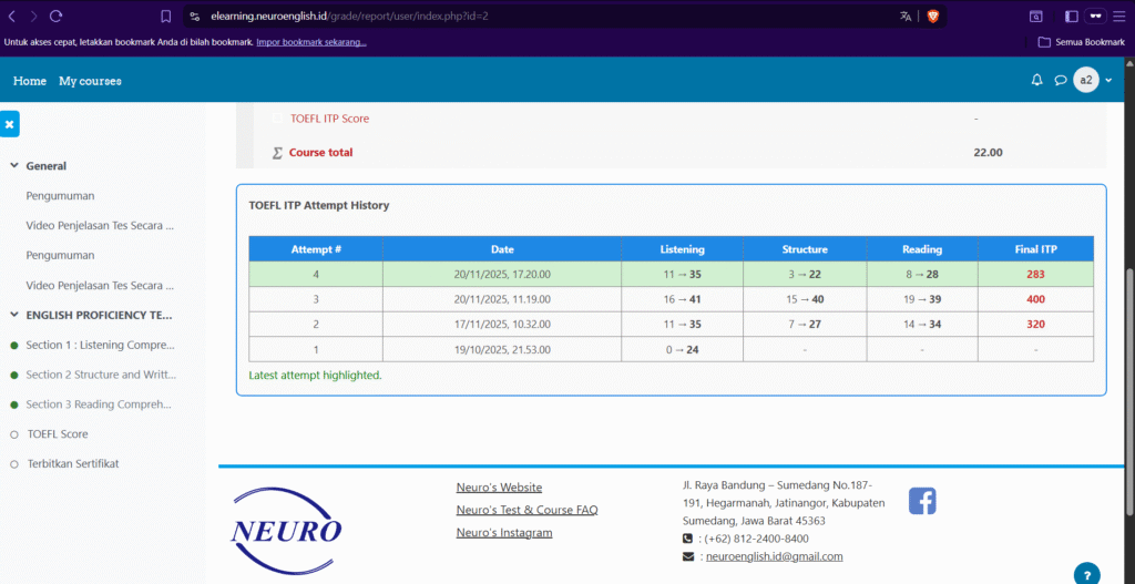 9. B. Masih di bagian toefl score silahkan scroll ke bawah dan Anda akan melihat history pengerjaan beserta skor tes masing-masing. Secara otomatis score yang akan di terbitkan sebagai sertifikat adalah score tes terbaru, namun Anda bisa juga request untuk menerbitkan score pada pengerjaan yang lain misalnya hasil dari tes ketiga. Maka, Anda wajib untuk request ke no Whatsapp Admin NEURO untuk di terbitkan hasil dari tes Ketiga bukan hasil yang terbaru. Jika tidak maka sertifikat akan otomatis diterbitkan hasil tes terbaru.