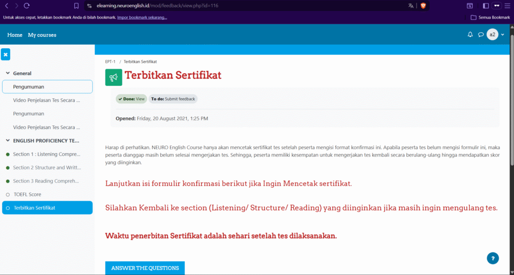 10. Apabila skor tes dirasa sudah cukup, anda dapat langsung klik bagian Terbitkan Sertifikat. Harap di perhatikan. NEURO English Course hanya akan mencetak sertifikat tes setelah peserta mengisi format konfirmasi ini. Apabila peserta tes belum mengisi formulir ini, maka peserta dianggap masih belum selesai mengerjakan tes. Sehingga, peserta memiliki kesempatan untuk mengerjakan tes kembali secara berulang-ulang hingga mendapatkan skor yang diinginkan.