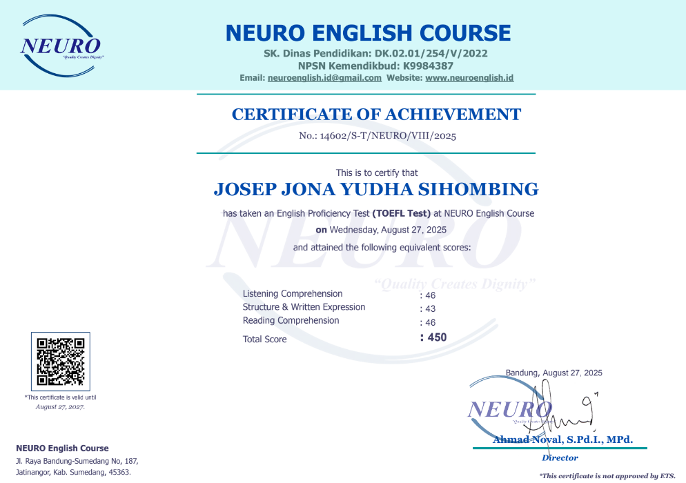 NEURO merupakan singkatan dari Necessity of English as Universal Reference of Occupations, sebuah lembaga Kursus bahasa Inggris yang yang telah berdiri semenjak tahun 2017 dan sudah meluluskan lebih dari 15.000++ Alumni yang tersebar di seluruh Indonesia bahkan luar negeri. Sertifkat NEURO English Course resmi dan sudah terdaftar di Kementerian Pendidikan, Kebudayaan, Riset, dan Teknologi (Kemendikbudristek) dengan rincian sebagai berikut :