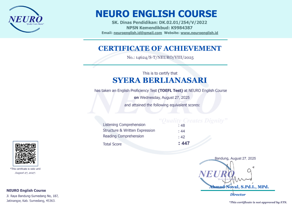 Nama Terdaftar               : LKP NEURO English Course
