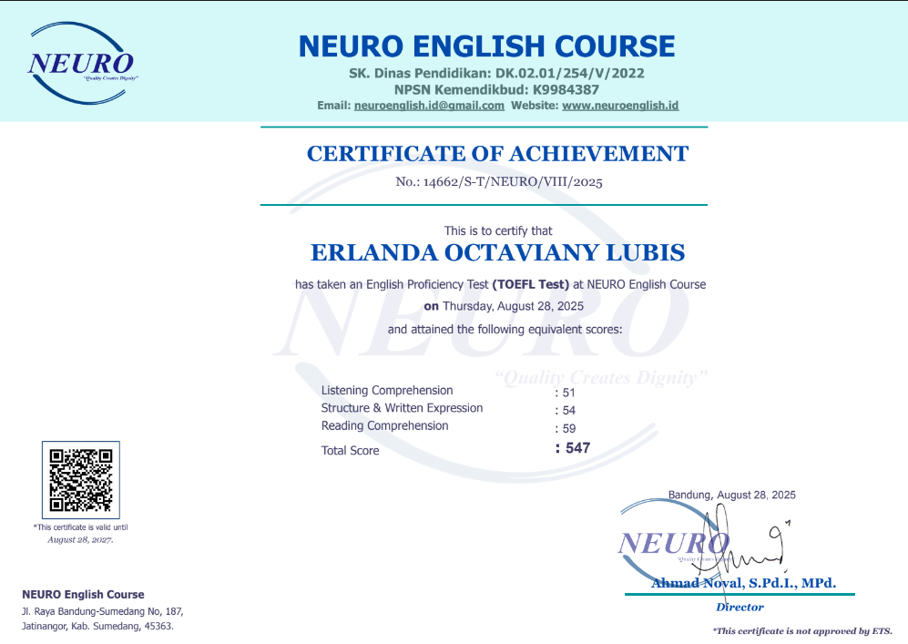 - Certificate Description: English Proficiency Test (TOEFL Test)
