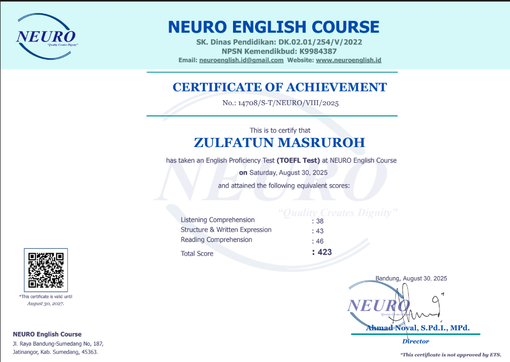 - Certificate Description: English Proficiency Test (TOEFL Test)