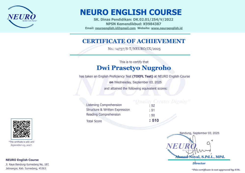 NEURO merupakan singkatan dari Necessity of English as Universal Reference of Occupations, sebuah lembaga Kursus bahasa Inggris yang yang telah berdiri semenjak tahun 2017 dan sudah meluluskan lebih dari 15.000++ Alumni yang tersebar di seluruh Indonesia bahkan luar negeri. Sertifkat NEURO English Course resmi dan sudah terdaftar di Kementerian Pendidikan, Kebudayaan, Riset, dan Teknologi (Kemendikbudristek) dengan rincian sebagai berikut :