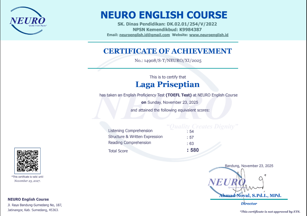 - Certificate Description: English Proficiency Test (TOEFL Test)