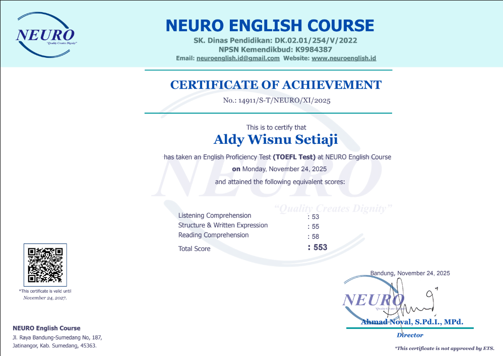 - Certificate Description: English Proficiency Test (TOEFL Test)