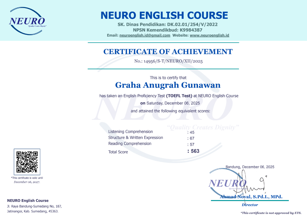 NEURO merupakan singkatan dari Necessity of English as Universal Reference of Occupations, sebuah lembaga Kursus bahasa Inggris yang yang telah berdiri semenjak tahun 2017 dan sudah meluluskan lebih dari 15.000++ Alumni yang tersebar di seluruh Indonesia bahkan luar negeri. Sertifkat NEURO English Course resmi dan sudah terdaftar di Kementerian Pendidikan, Kebudayaan, Riset, dan Teknologi (Kemendikbudristek) dengan rincian sebagai berikut :