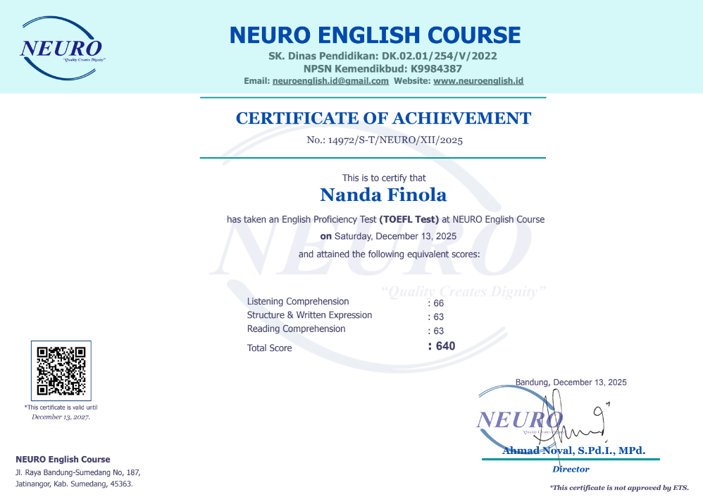 NEURO merupakan singkatan dari Necessity of English as Universal Reference of Occupations, sebuah lembaga Kursus bahasa Inggris yang yang telah berdiri semenjak tahun 2017 dan sudah meluluskan lebih dari 15.000++ Alumni yang tersebar di seluruh Indonesia bahkan luar negeri. Sertifkat NEURO English Course resmi dan sudah terdaftar di Kementerian Pendidikan, Kebudayaan, Riset, dan Teknologi (Kemendikbudristek) dengan rincian sebagai berikut :