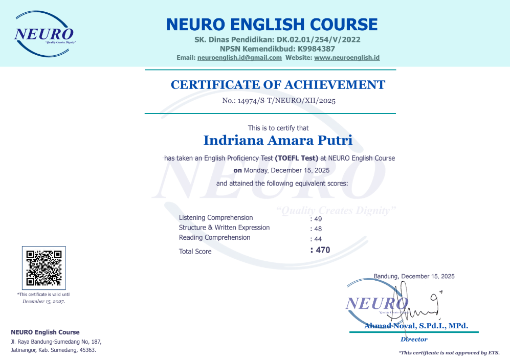 - Certificate Description: English Proficiency Test (TOEFL Test)