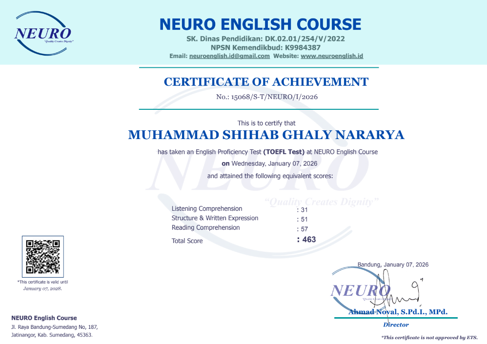 - Certificate Description: English Proficiency Test (TOEFL Test)