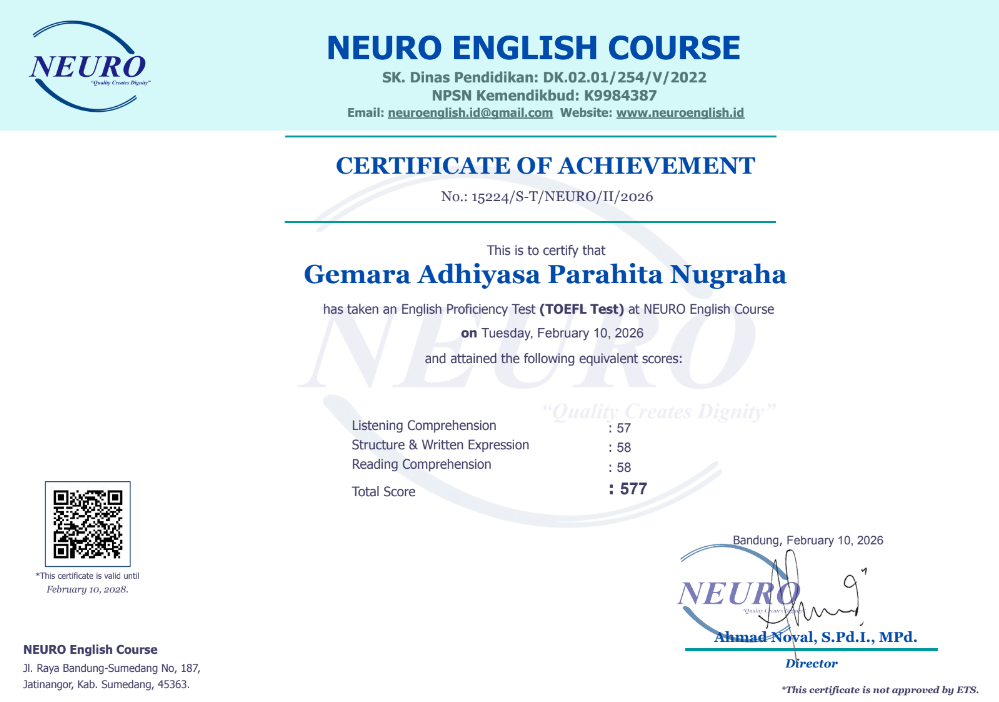 NEURO merupakan singkatan dari Necessity of English as Universal Reference of Occupations, sebuah lembaga Kursus bahasa Inggris yang yang telah berdiri semenjak tahun 2017 dan sudah meluluskan lebih dari 15.000++ Alumni yang tersebar di seluruh Indonesia bahkan luar negeri. Sertifkat NEURO English Course resmi dan sudah terdaftar di Kementerian Pendidikan, Kebudayaan, Riset, dan Teknologi (Kemendikbudristek) dengan rincian sebagai berikut :