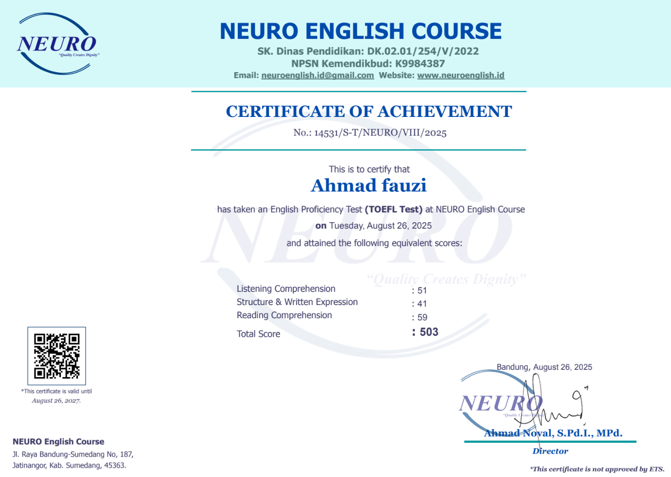 Nama Terdaftar : LKP NEURO English Course