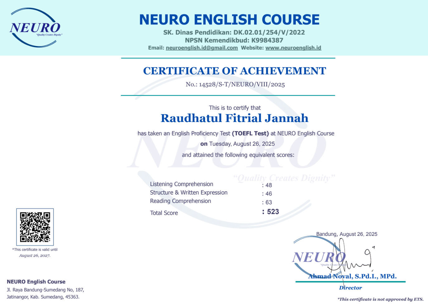 Nama Terdaftar : LKP NEURO English Course